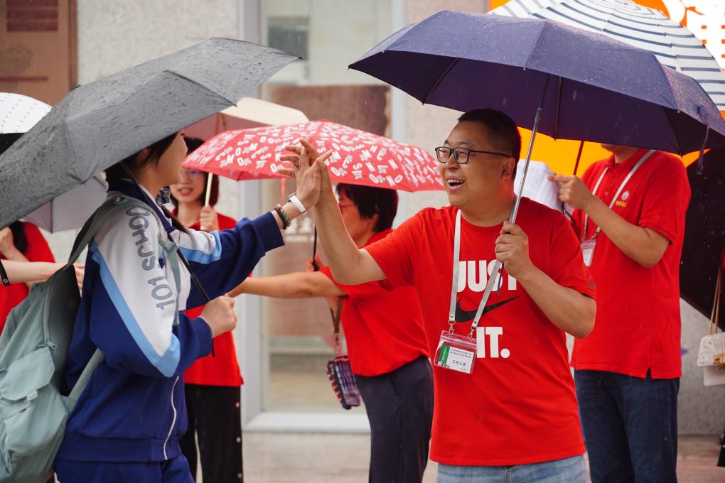 雖然天空下著雨,北京一零一中學(xué)的送考老師們還是早早在校門口排成一列,與陸續(xù)趕來的考生一一擊掌鼓勁。在校門口刷臉驗證身份后,考生通過提前搭設(shè)的紅色晴雨走廊,步入候考區(qū)及考場。