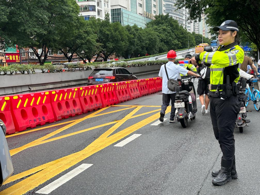 6月7日上午,交警在華南師范大學(xué)附屬中學(xué)考點外指揮交通。新華社記者楊淑馨 攝