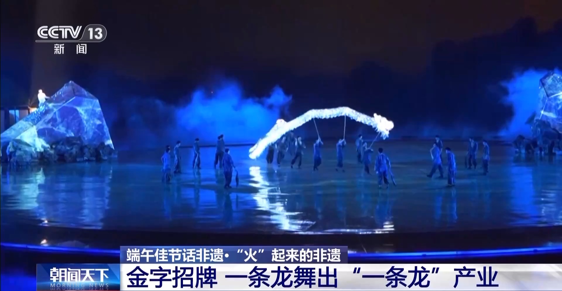 非遺的核心技藝在生產實踐中得到傳承。眼下,光是龍燈扎制業(yè)務,已經遍布全國十幾個省份,平均每年訂單超過1000萬元。如今,扎制好的龍燈,更多是被用在當?shù)氐凝埼璞硌萆?。這是大型非遺山水實景劇《追夢 銅梁龍》的演出現(xiàn)場,觀眾可以看到水云龍、荷花龍等十幾種銅梁傳統(tǒng)龍舞,其中壓軸戲,便是銅梁火龍。
