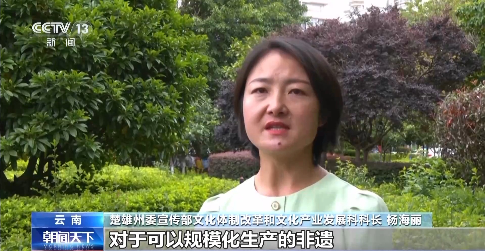 楚雄州委宣傳部文化體制改革和文化產業(yè)發(fā)展科科長 楊海麗:對于可以規(guī)?;a的非遺,我們提倡生產性保護。適當引導非遺工藝加大與創(chuàng)意設計的融合力度,推動產品開發(fā)向多元領域拓展,變成文化產品、時尚產品、潮流產品。