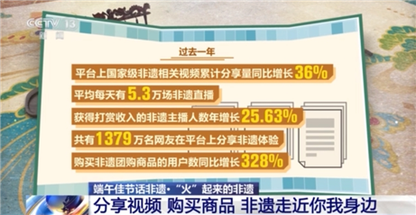 社交媒體平臺近日發(fā)布的《2024非遺數(shù)據(jù)報告》顯示,過去一年,平臺上國家級非遺相關視頻累計分享量同比增長36%,平均每天有5.3萬場非遺直播,獲得打賞收入的非遺主播人數(shù)年增長25.63%,共有1379萬名網友在平臺上分享非遺體驗,購買非遺團購商品的用戶數(shù)同比增長328%。 某購物平臺數(shù)據(jù)顯示,今年前三季度,以“非遺”為關鍵詞的搜索量同比增長168%,“非遺”主題相關的團購訂單量同比提升245%。