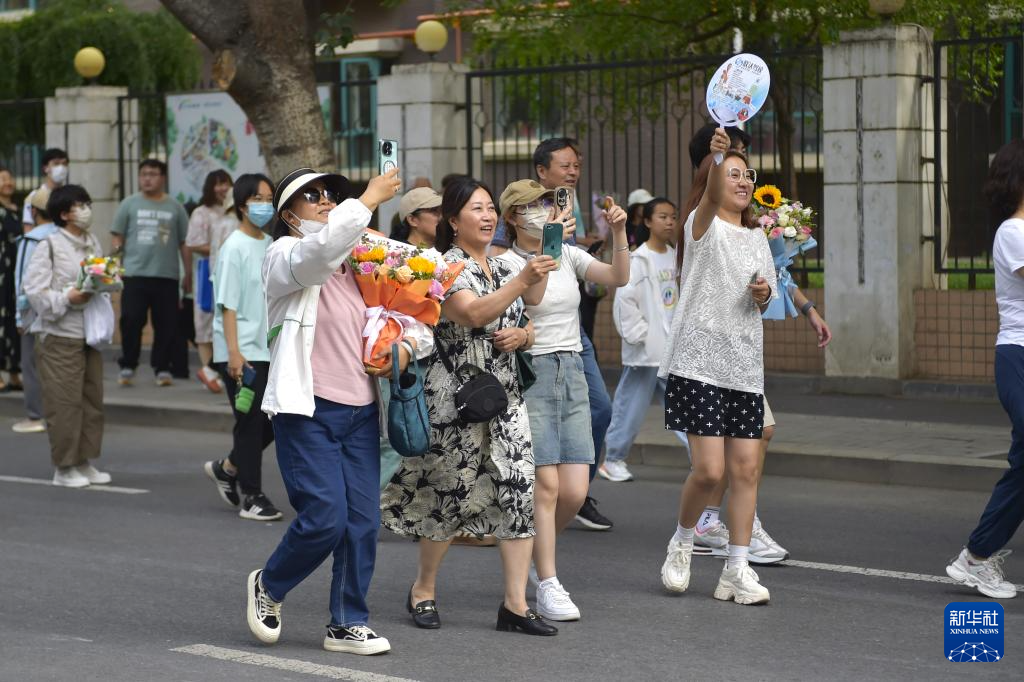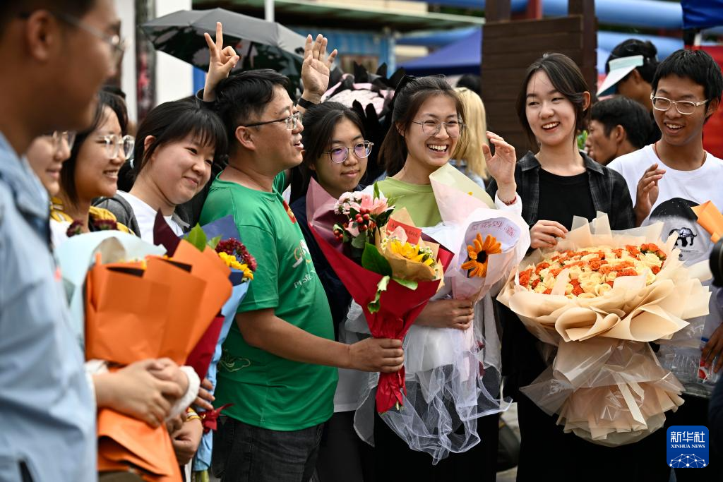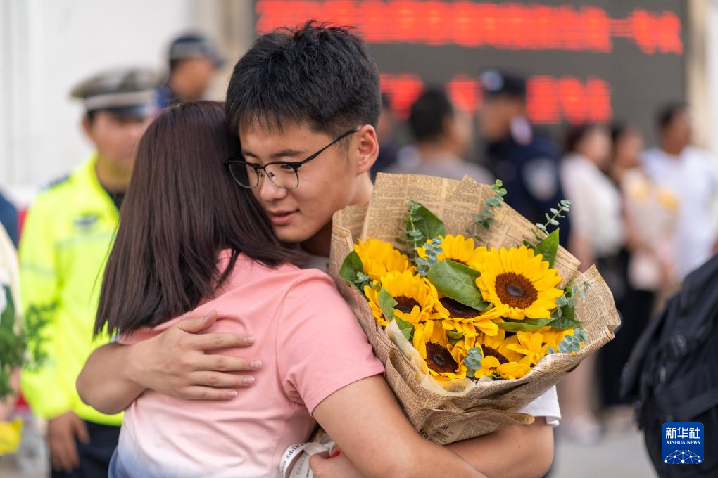 6月8日,在河南省焦作市博愛縣第一中學(xué)考點,家長為走出考場的孩子送上鮮花。新華社發(fā)(程全攝)