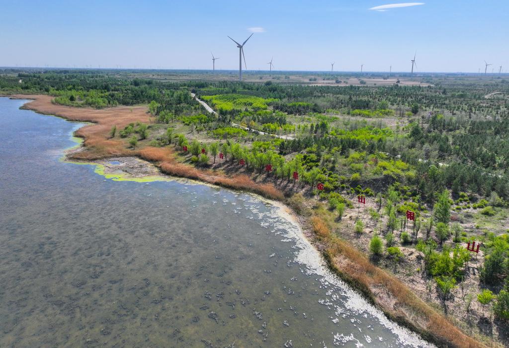5月15日,在內(nèi)蒙古通遼市科爾沁沙地“雙百萬(wàn)畝”綜合治理工程努古斯臺(tái)項(xiàng)目區(qū),沙地上綠意盎然(無(wú)人機(jī)照片)。新華社 連振 攝