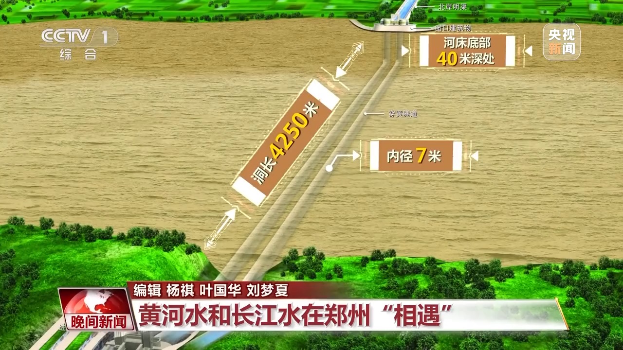 南水北調(diào)工程建設(shè)者在鄭州花園口西黃河河床底部40米深處開鑿兩條隧道,穿黃隧道為雙線有壓輸水隧道,單個(gè)洞長(zhǎng)4250米,內(nèi)徑7米,這樣的內(nèi)徑可以滿足洞內(nèi)跑汽車。有了“穿黃工程”,北上的長(zhǎng)江水通過兩條穿黃隧道與黃河立體交叉相遇。平時(shí),黃河水在上面流,南水北調(diào)的長(zhǎng)江水在河底隧道中流過,兩者上下而過,猶如一條巨龍?jiān)邳S河之下隱去了身影。