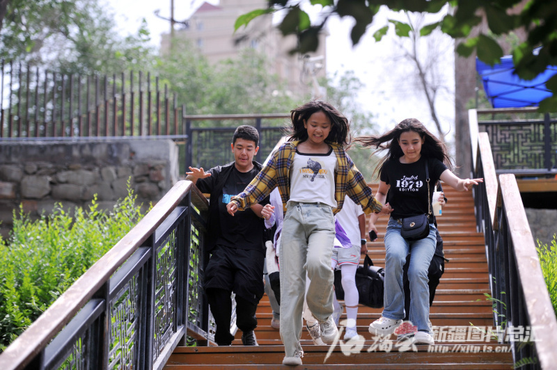 △6月15日,幾位中學(xué)生在烏魯木齊市水磨溝區(qū)水磨河濱河景觀(guān)帶玩耍。石榴云/新疆日?qǐng)?bào)記者 秦梅花攝