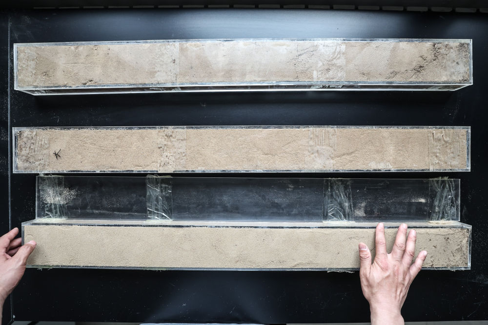 “草根博士”呂林有在遼寧省農(nóng)業(yè)科學(xué)院沙地治理與利用研究所章古臺基地實驗室整理提取的沙地土壤剖面樣本(2024年5月30日攝)。新華社記者 潘昱龍 攝