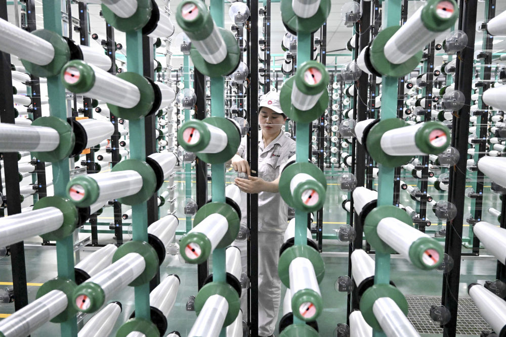 2月22日,在位于河南安陽林州市的河南光遠新材料股份有限公司電子布準備車間,工作人員在檢查整經(jīng)機機臺。新華社記者 李安 攝