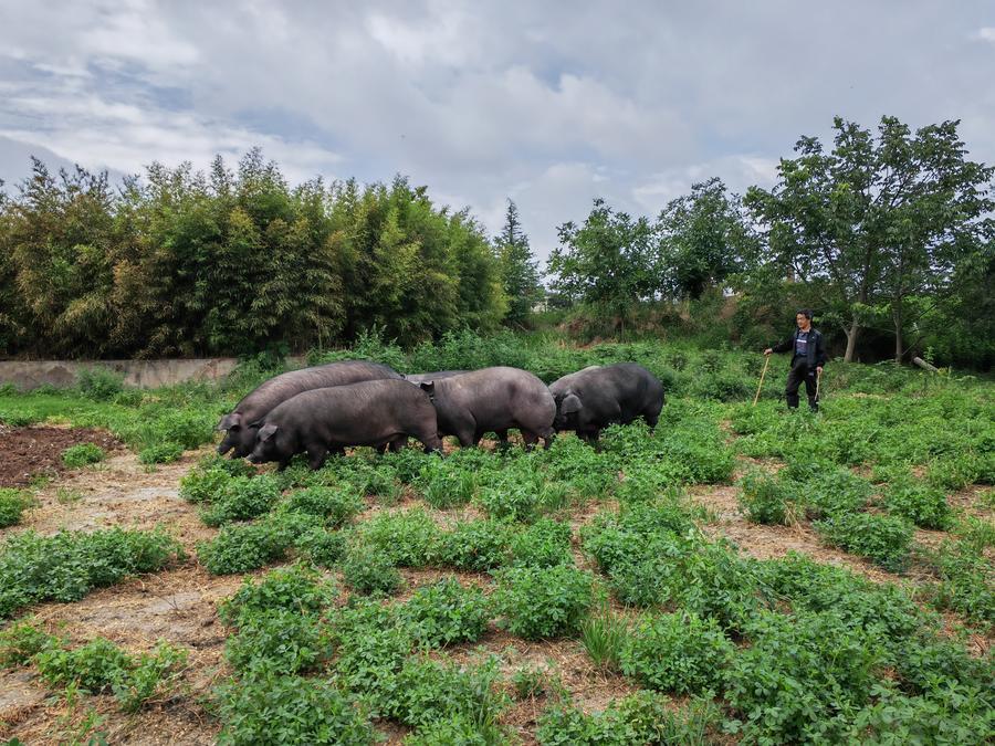 6月2日,云南老浦家火腿實業(yè)發(fā)展有限公司養(yǎng)殖的烏金豬在覓食。新華社記者 林碧鋒 攝