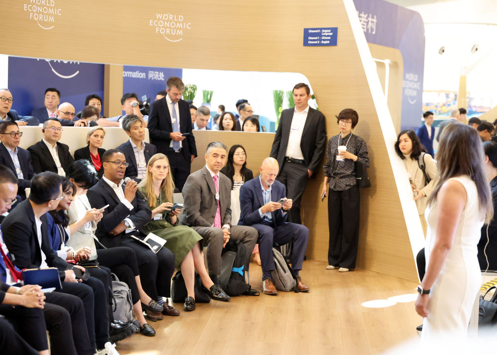 6月26日,在夏季達(dá)沃斯論壇主會場大連國際會議中心,嘉賓交流討論。新華社記者李鋼攝