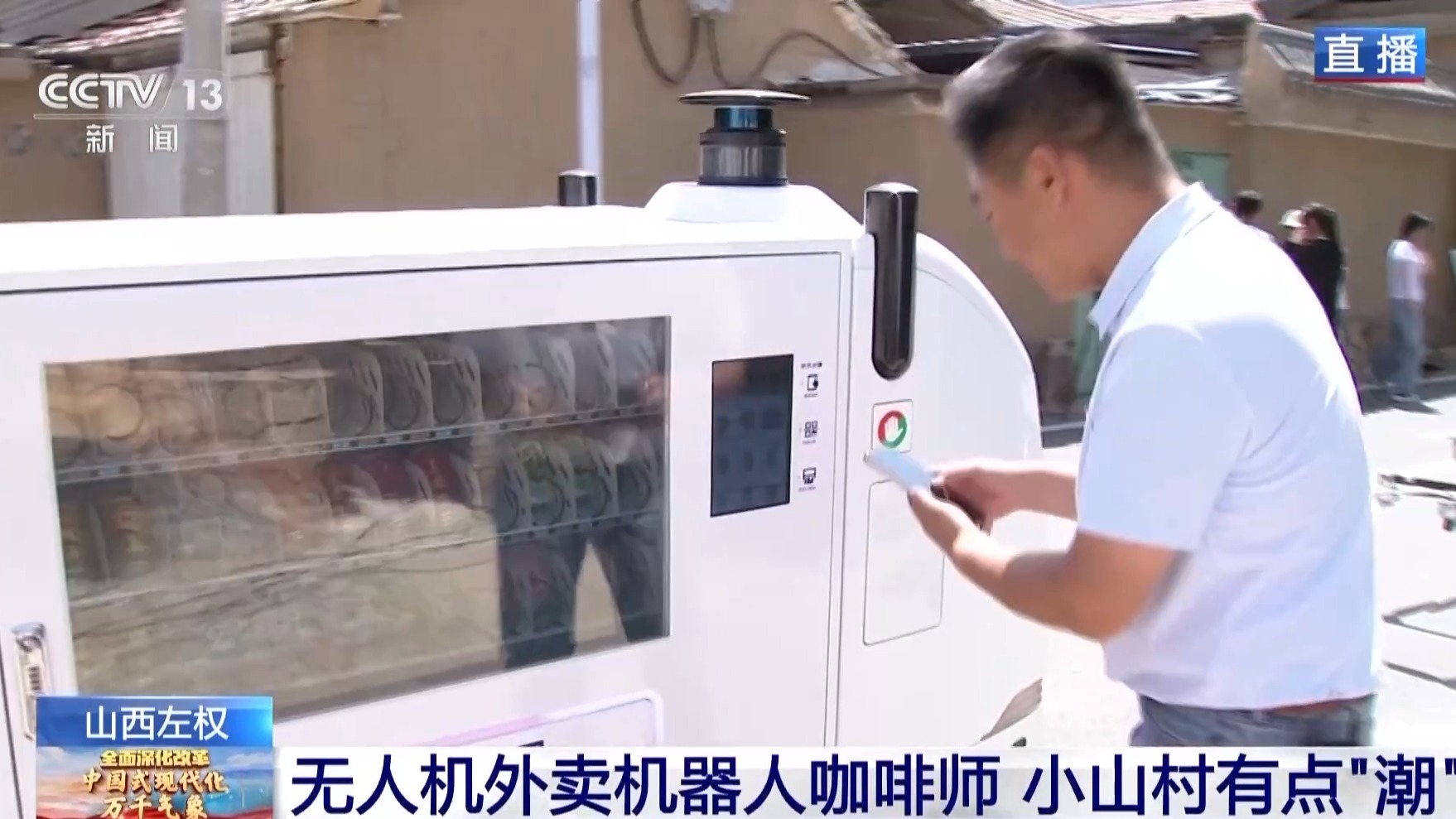 這個(gè)小山村里的科技范不止于此,大家通過鏡頭可以看到,在我身旁往來不少車輛,它們好像有一些不同,你看這個(gè)在街上到處行進(jìn)的無人售貨車,我們走到它旁邊就會(huì)停止,然后手機(jī)掃描二維碼可以購買到飲料、零食等商品了。