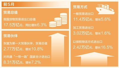 我國(guó)外貿(mào)前5月成績(jī)單近日出爐,貨物貿(mào)易進(jìn)出口總值同比增長(zhǎng)6.3%。其中,出口增長(zhǎng)6.1%,進(jìn)口增長(zhǎng)6.4%。5月當(dāng)月,進(jìn)出口同比增長(zhǎng)8.6%,出口增長(zhǎng)11.2%,進(jìn)口增長(zhǎng)5.2%。