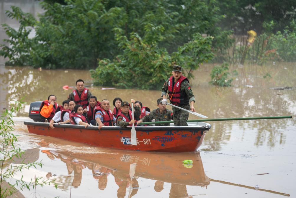 這是7月1日在平江縣天岳街道大西村拍攝的被困群眾轉(zhuǎn)移現(xiàn)場。新華社記者陳思汗攝