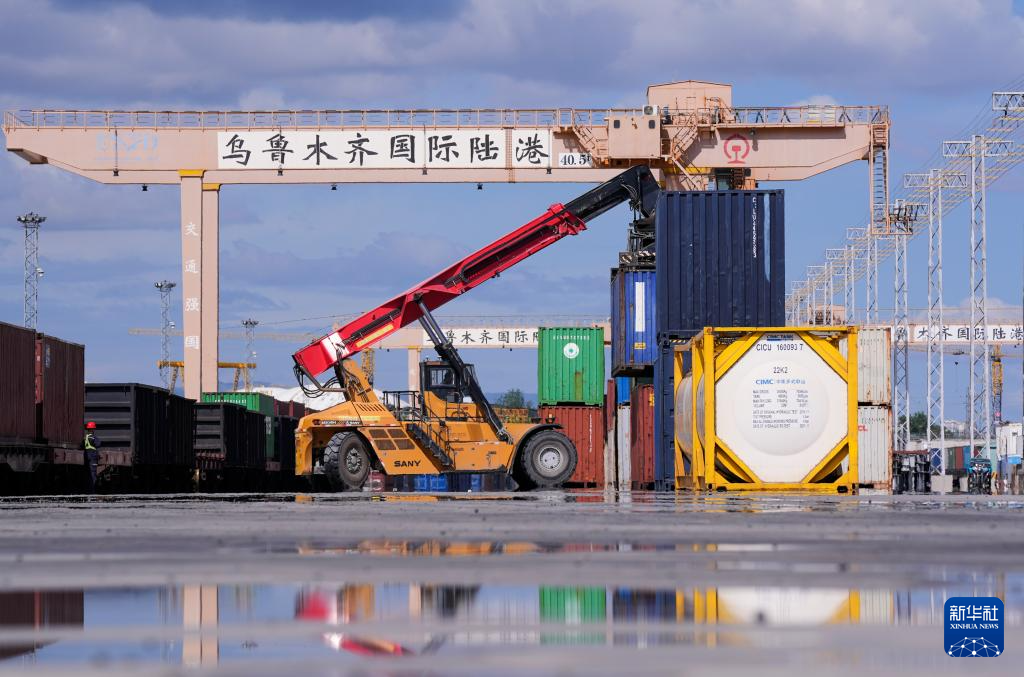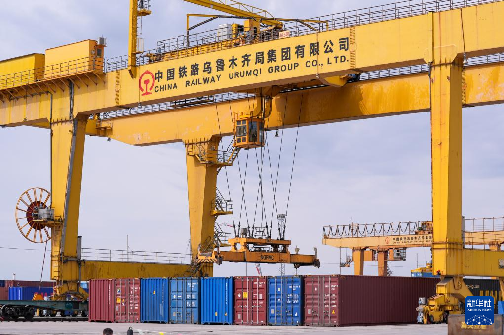 在新疆烏魯木齊國際陸港區(qū),集裝箱裝卸作業(yè)有序進行(2024年5月27日攝)。新華社記者 王菲 攝