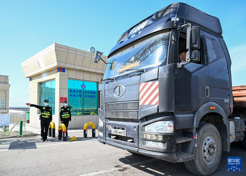 2024年4月18日12時許,在霍爾果斯公路口岸,一輛來自哈薩克斯坦的貨車通過查驗站。新華社記者 陳朔 攝