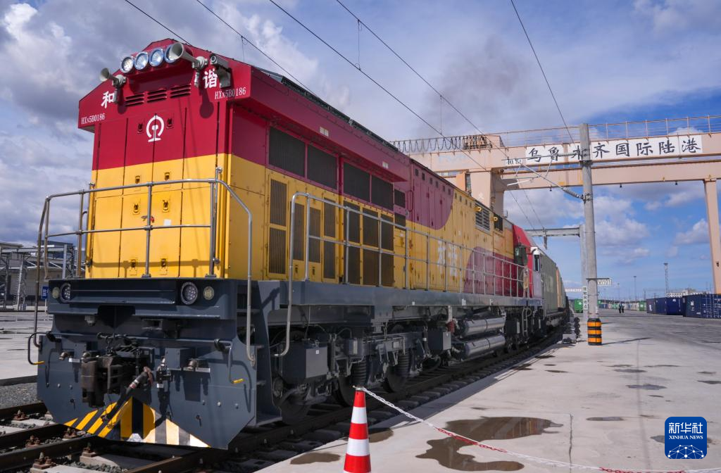 2024年5月27日,一列滿載貨物的中歐班列駛離新疆烏魯木齊國際陸港區(qū)。新華社記者 王菲 攝
