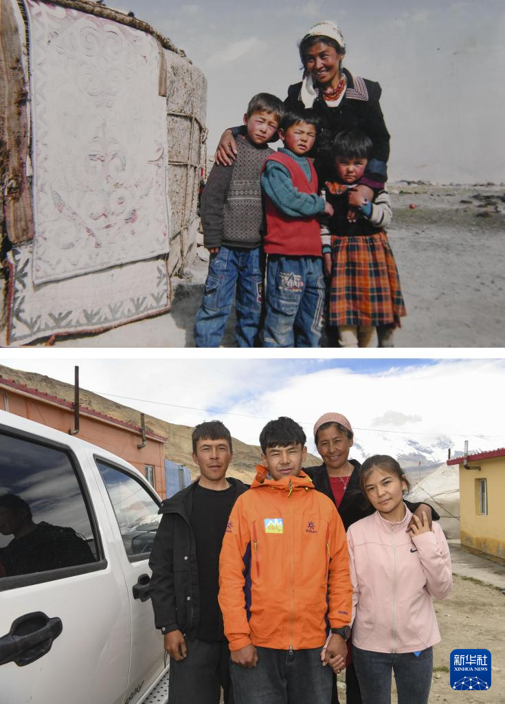 拼版照片:上圖為國外登山隊(duì)于2007年8月22日為塔西巴伊(前中)、哥哥(前左)、妹妹(前右)、母親在慕士塔格峰下牧場氈房旁拍攝的合影(7月5日翻拍資料照片);下圖為2024年7月5日塔西巴伊(前中)、哥哥(前左)、妹妹(前右)、母親在慕士塔格峰下新居前拍攝的合影(新華社記者胡虎虎攝)。新華社發(fā)