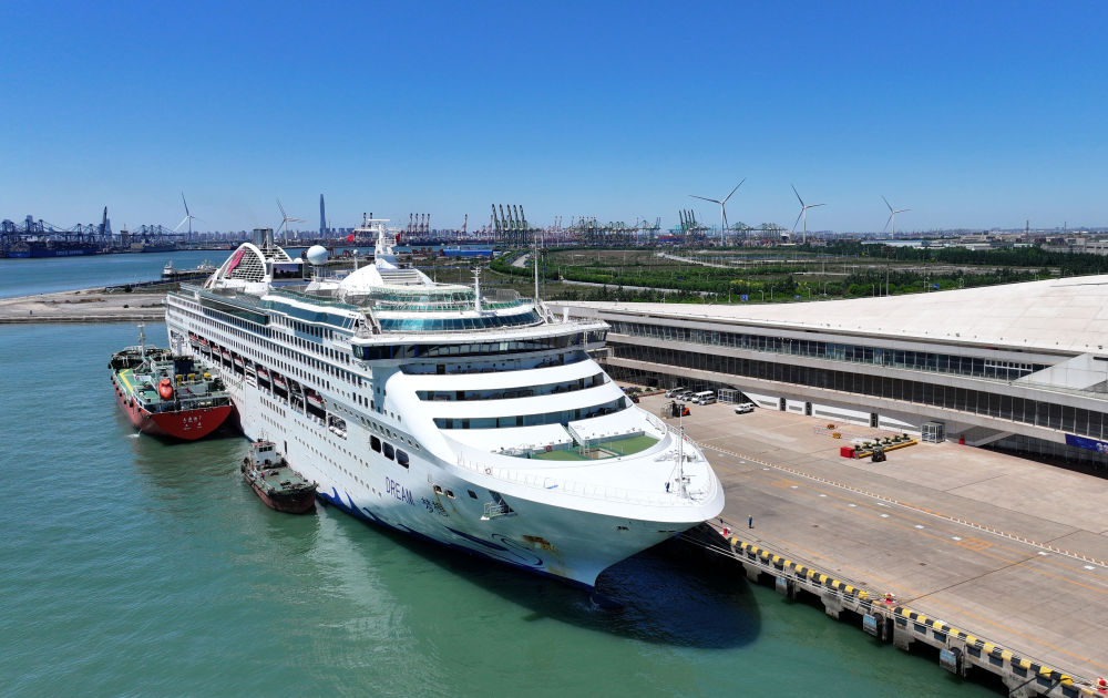 5月15日,“夢想”號郵輪停靠在天津國際郵輪母港(無人機照片)。新華社記者 趙子碩 攝
