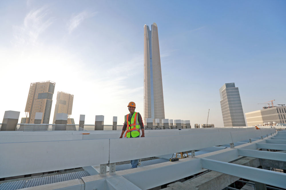 這是2023年11月22日在埃及開羅以東的埃及新行政首都中央商務(wù)區(qū)拍攝的一名在高樓樓頂施工的中國(guó)工人。新華社記者隋先凱攝