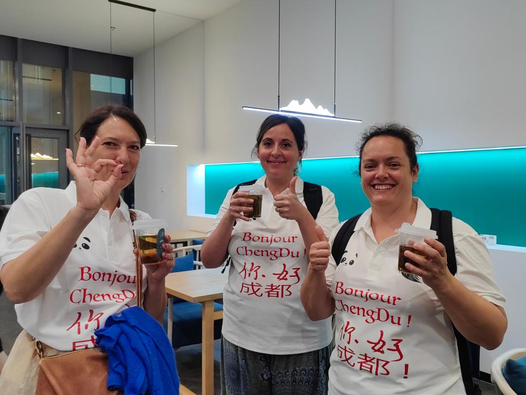 7月13日,在品嘗中藥茶飲后,三名法國(guó)中醫(yī)藥愛(ài)好者表示非常滿意。新華社記者 董小紅 攝