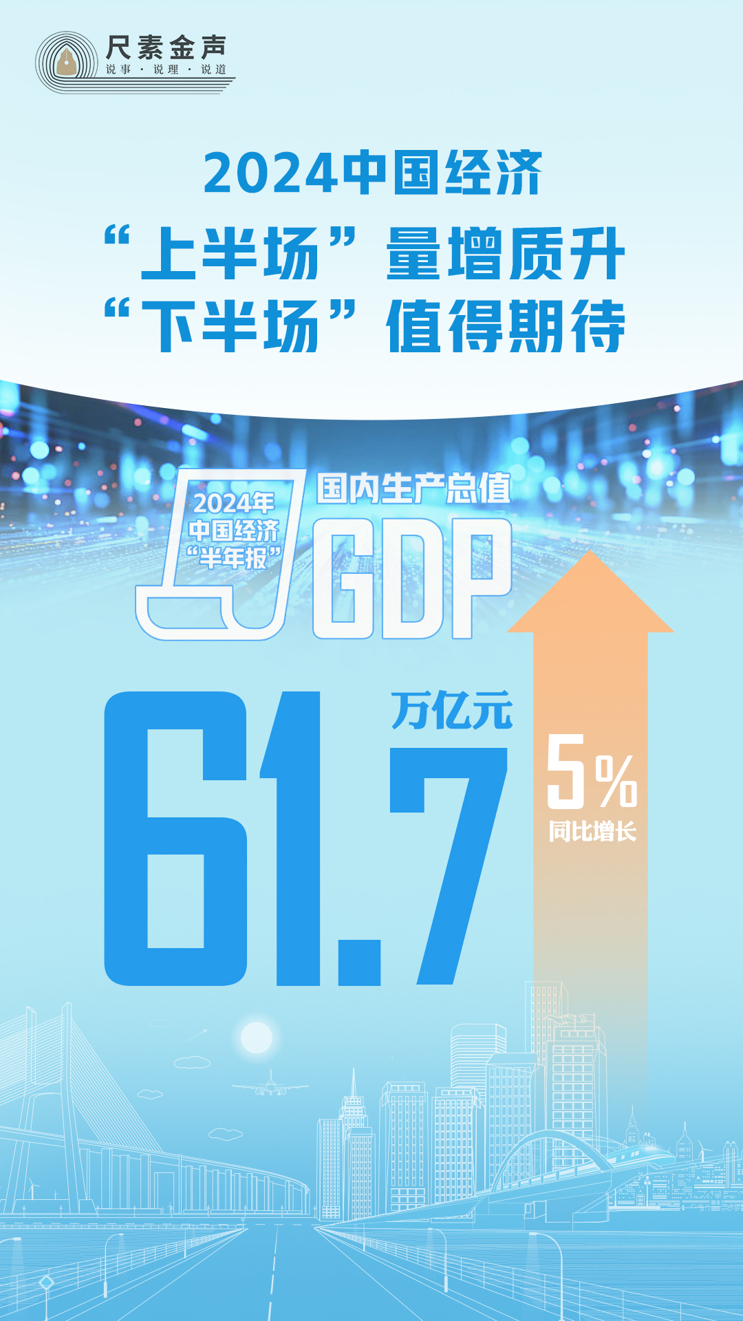 正在北京舉行的黨的二十屆三中全會,將重點研究進一步全面深化改革、推進中國式現(xiàn)代化。改革的“時代新篇”萬眾矚目,中國的發(fā)展也令人高度關注——同日,國家統(tǒng)計局發(fā)布2024年中國經(jīng)濟“半年報”:國內(nèi)生產(chǎn)總值(GDP)61.7萬億元,同比增長5%。結(jié)合二季度國內(nèi)外形勢,預計上半年中國經(jīng)濟增速仍將保持領先,仍是世界經(jīng)濟增長的重要引擎和穩(wěn)定力量。
