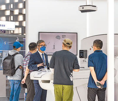 在2023世界人工智能大會(huì)上,參觀(guān)者正在了解通用電氣醫(yī)療深度天眼CT。
