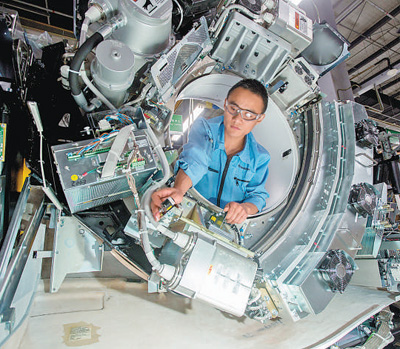 去年,北京生產(chǎn)基地?cái)U(kuò)建了2000多平方米的高端核醫(yī)學(xué)分子影像設(shè)備生產(chǎn)線(xiàn),負(fù)責(zé)核醫(yī)學(xué)PET/CT設(shè)備生產(chǎn)。目前,北京生產(chǎn)基地已具備從16排到256排CT機(jī)、分子影像、手術(shù)機(jī)、血管機(jī)、骨密度儀、核醫(yī)學(xué)PET/CT設(shè)備以及探測(cè)器、球管等零部件全面生產(chǎn)能力。其CT設(shè)備部件的產(chǎn)品設(shè)計(jì)和工藝流程領(lǐng)先全球,部分工藝被通用電氣醫(yī)療海外工廠(chǎng)采納。