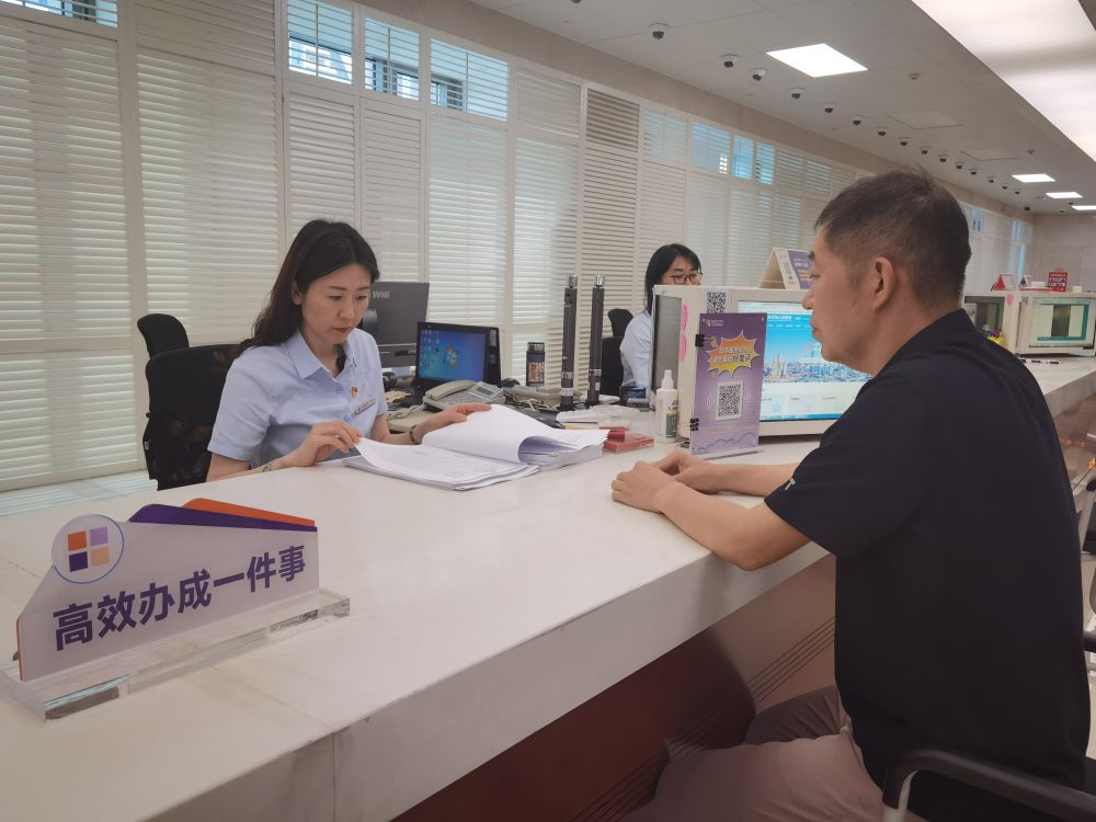 7月17日,在天津?yàn)I海新區(qū)政務(wù)服務(wù)中心“高效辦成一件事”專(zhuān)區(qū),企業(yè)負(fù)責(zé)人正在提交申請(qǐng)材料。新華社記者楊文 攝