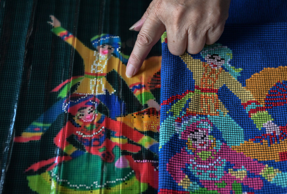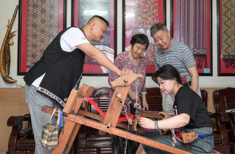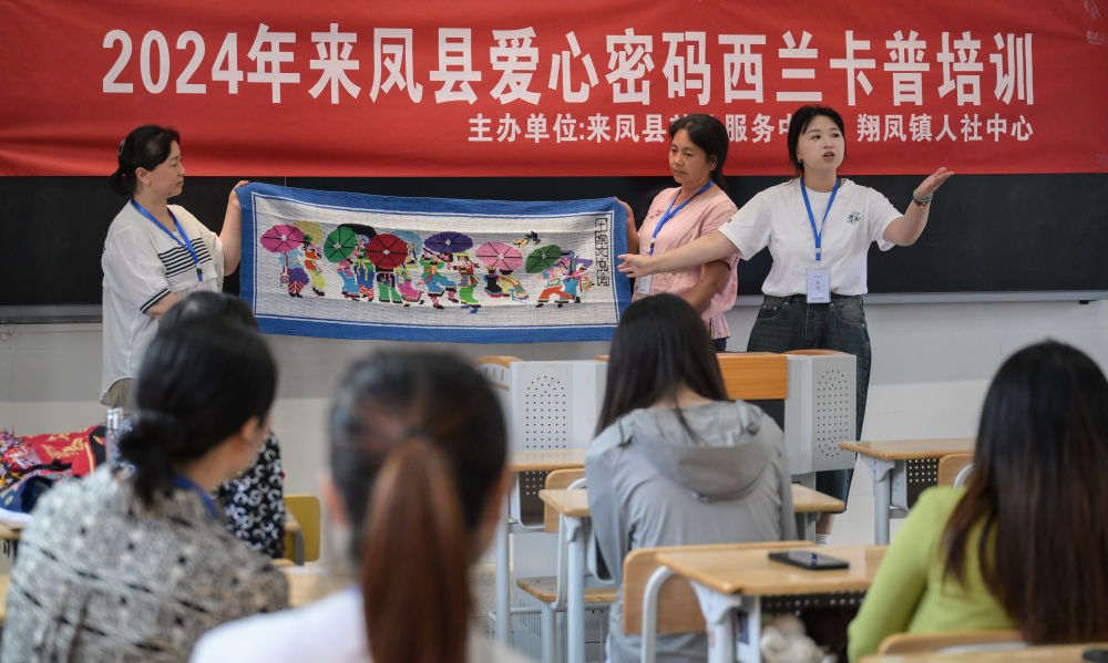 7月2日,唐洪祥的孫女唐鳴珂(后右一)在來鳳縣西蘭卡普培訓(xùn)班上展示西蘭卡普成品。今年29歲的唐鳴珂國外留學(xué)后回到家鄉(xiāng),從事西蘭卡普的傳承發(fā)展工作。