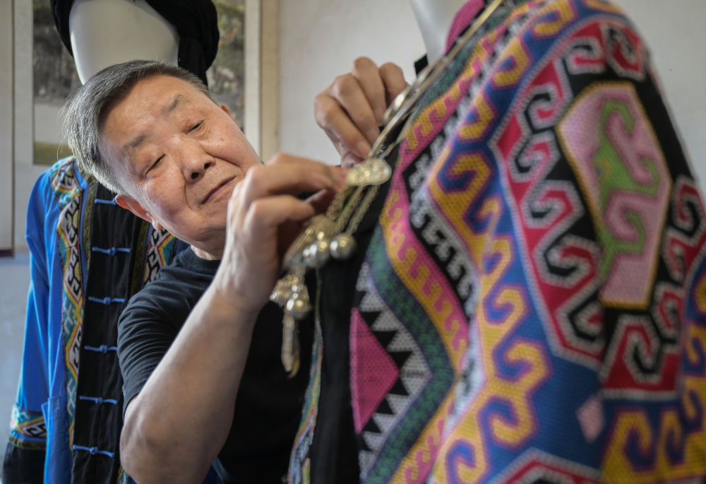 7月2日,唐洪祥整理用西蘭卡普制作的土家服飾。