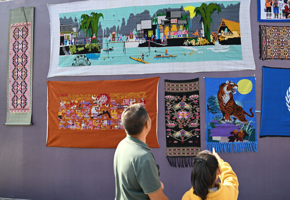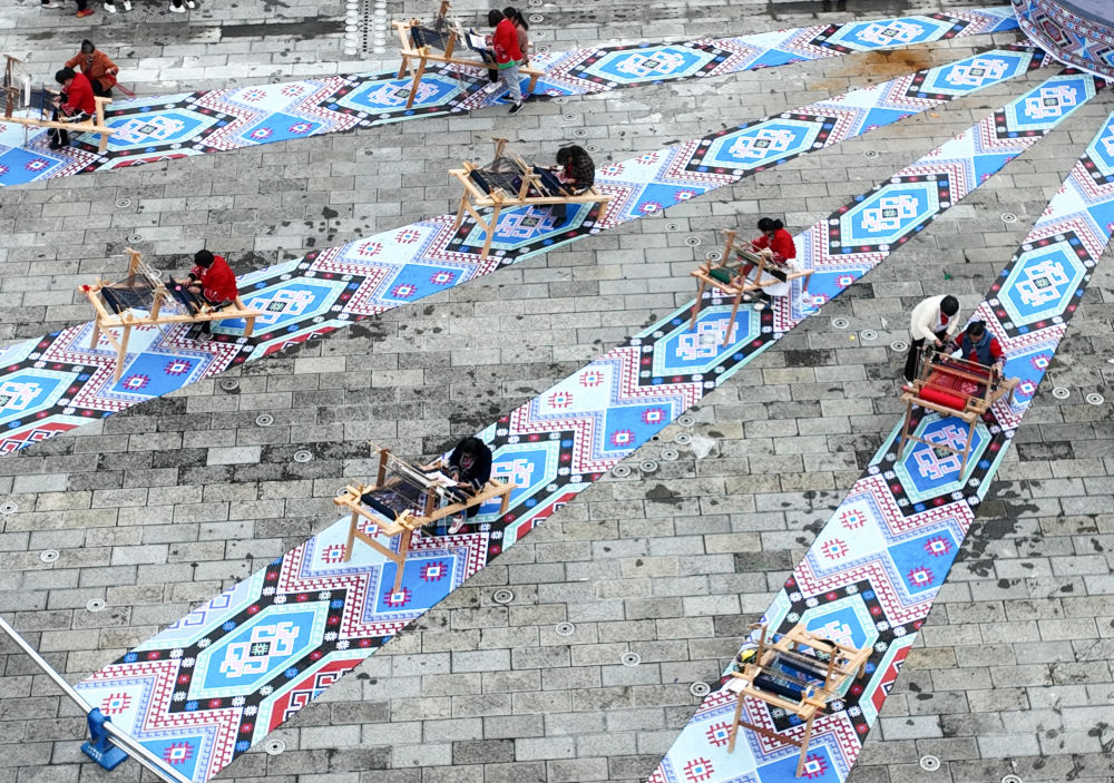 織錦女工在來鳳縣龍鳳文化中心廣場現(xiàn)場制作西蘭卡普,展示非遺技藝(2023年10月28日攝,無人機照片)。