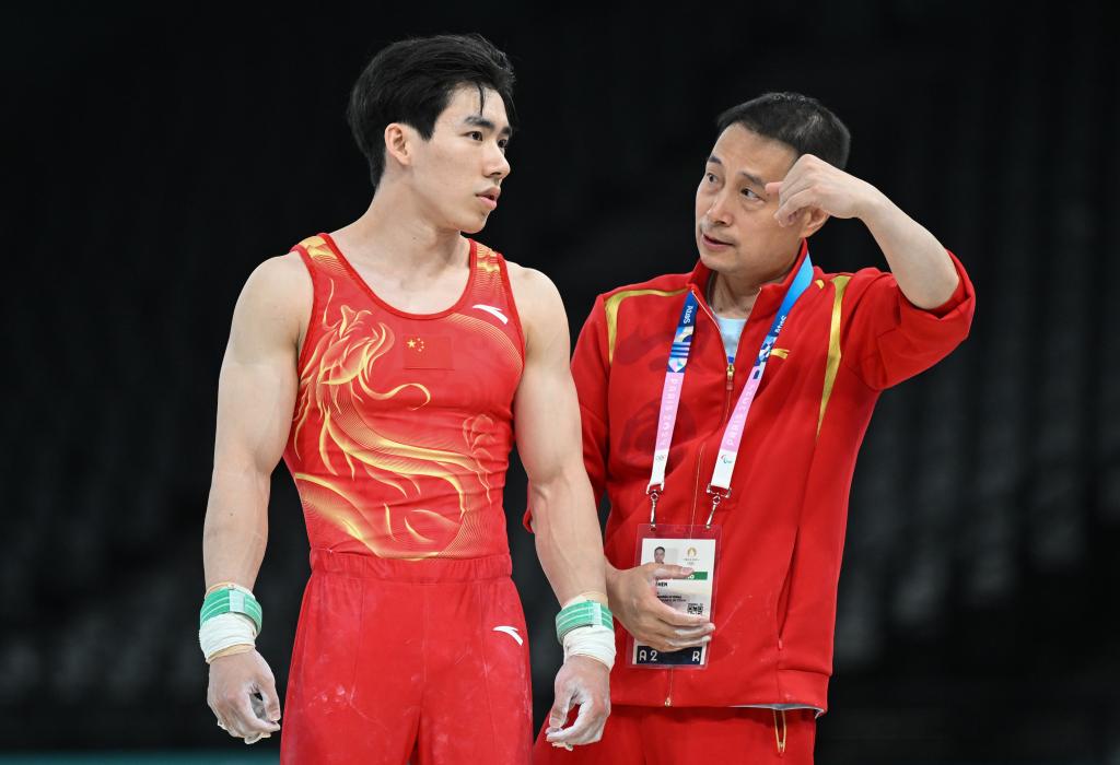 7月24日,中國男子體操隊在巴黎進行賽臺訓(xùn)練,中國隊選手張博恒(左)在準備吊環(huán)項目訓(xùn)練。新華社記者 程敏 攝