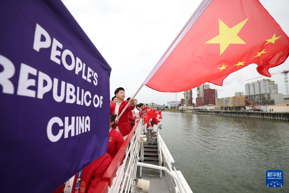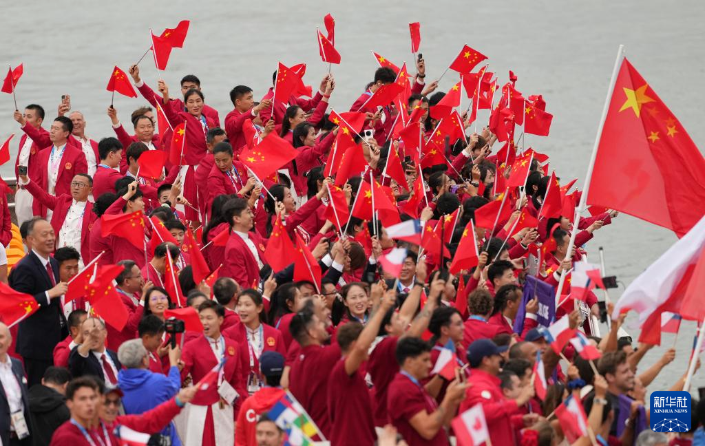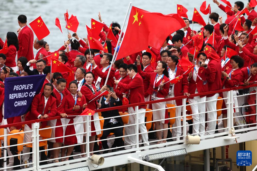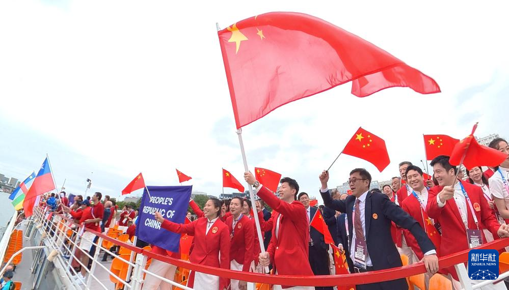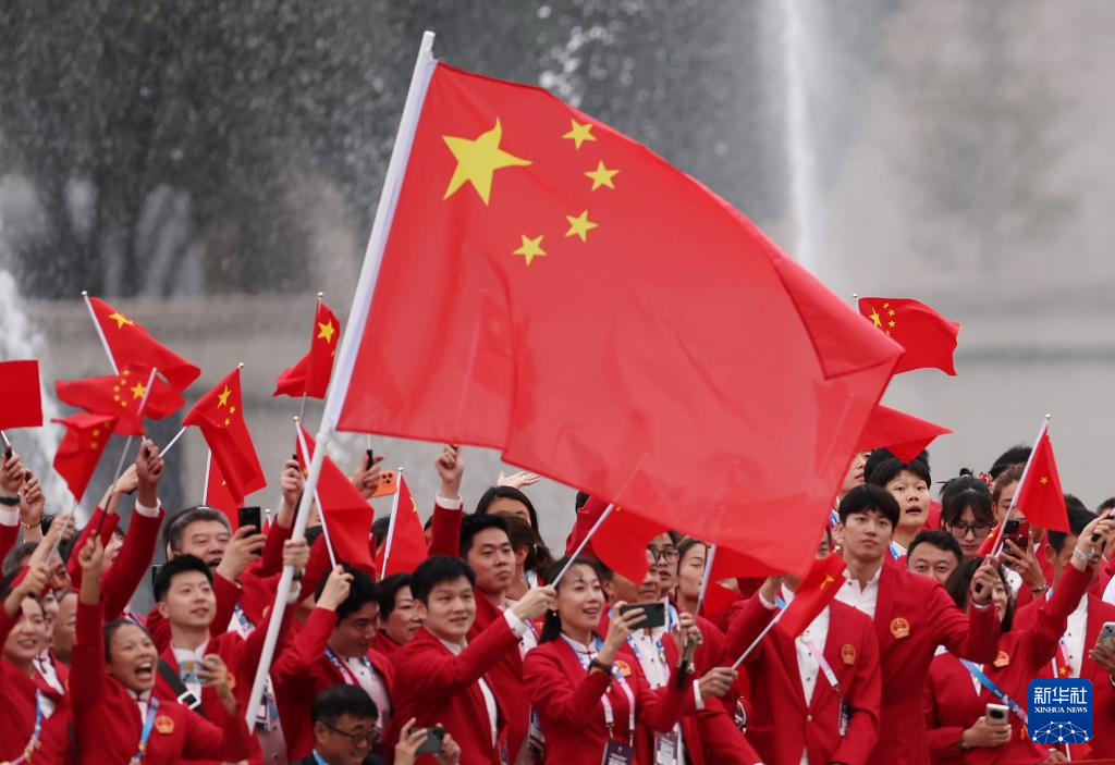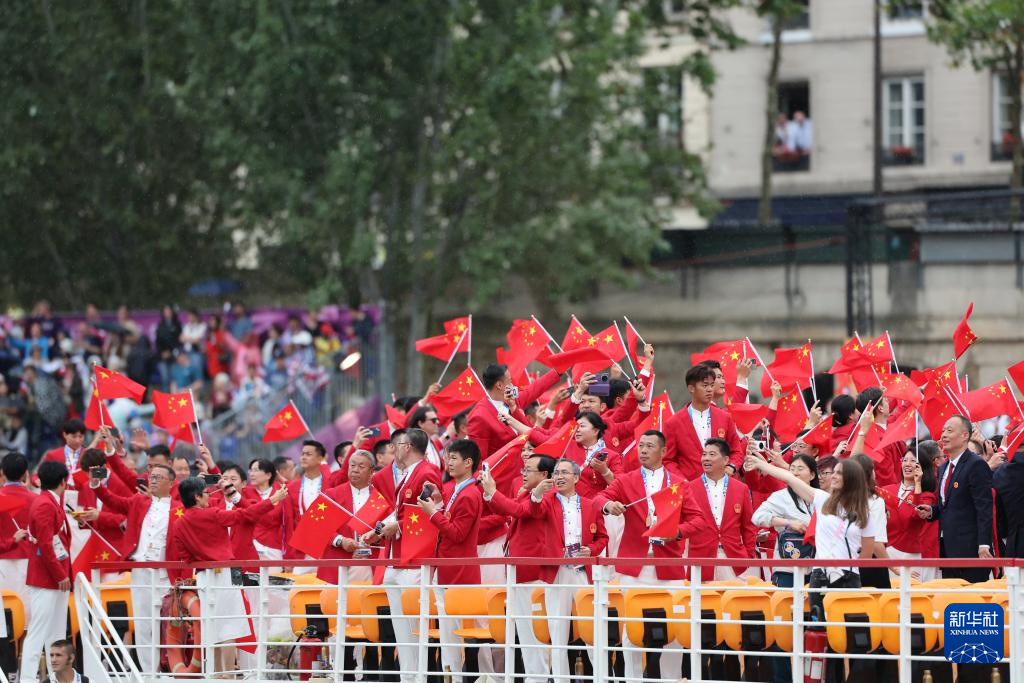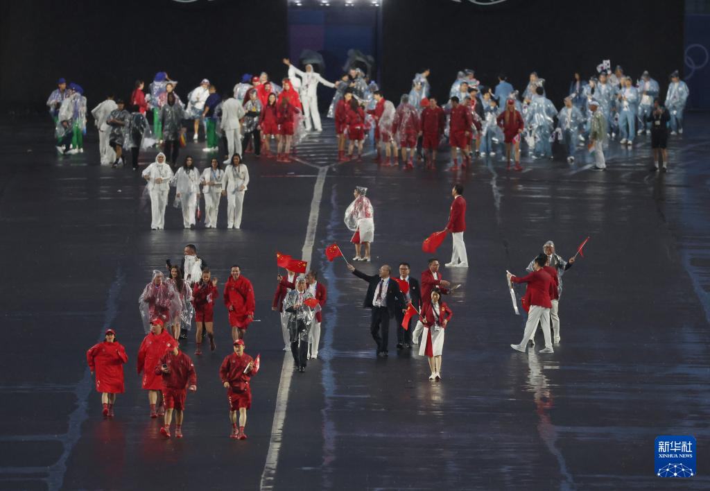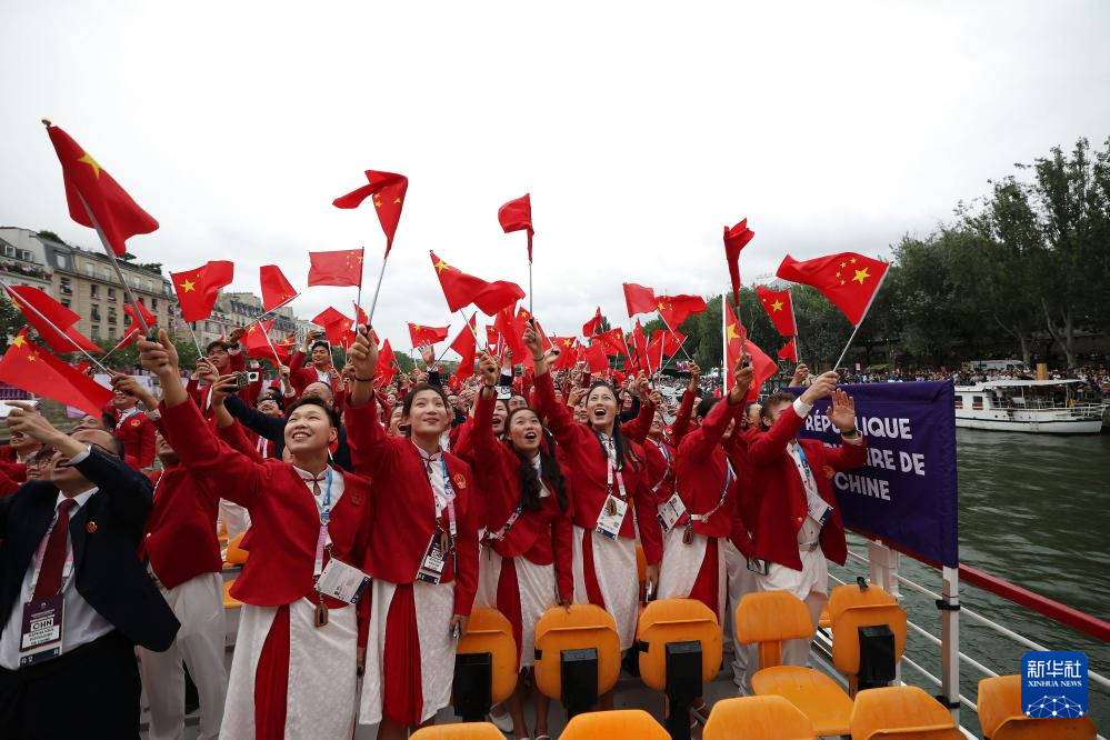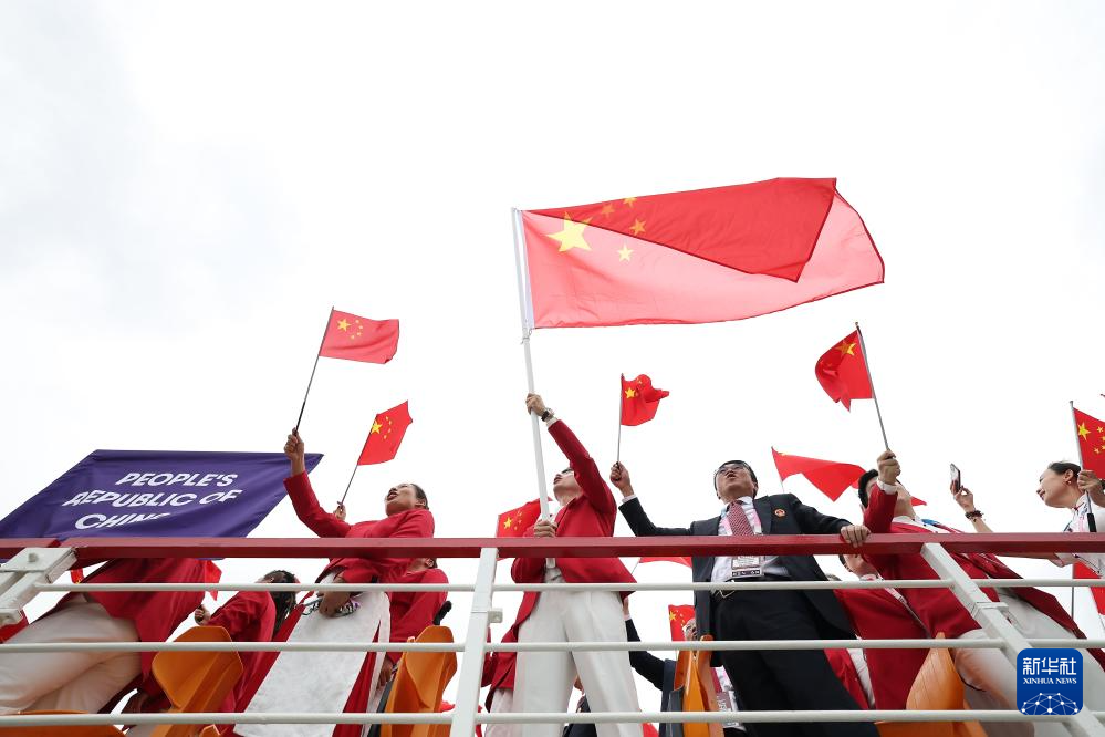 7月26日,中國(guó)體育代表團(tuán)在開(kāi)幕式上。新華社記者 郭昱 攝