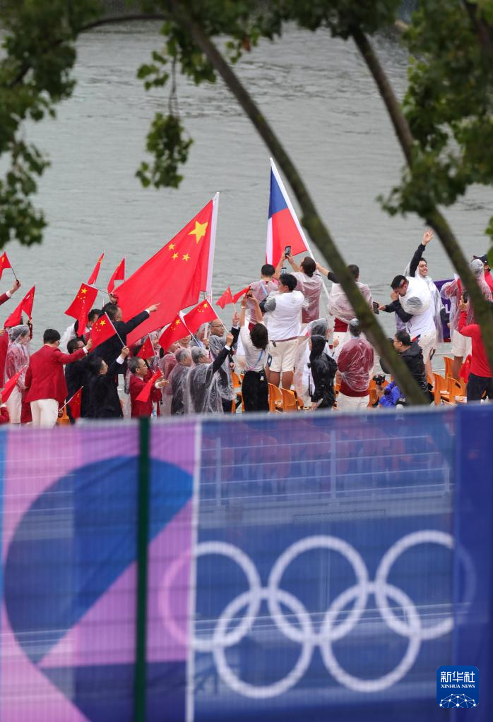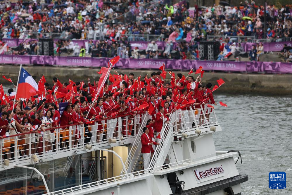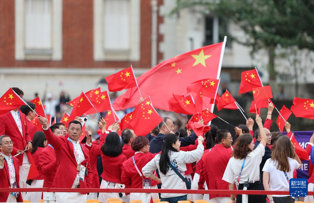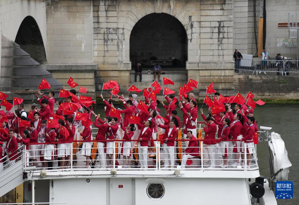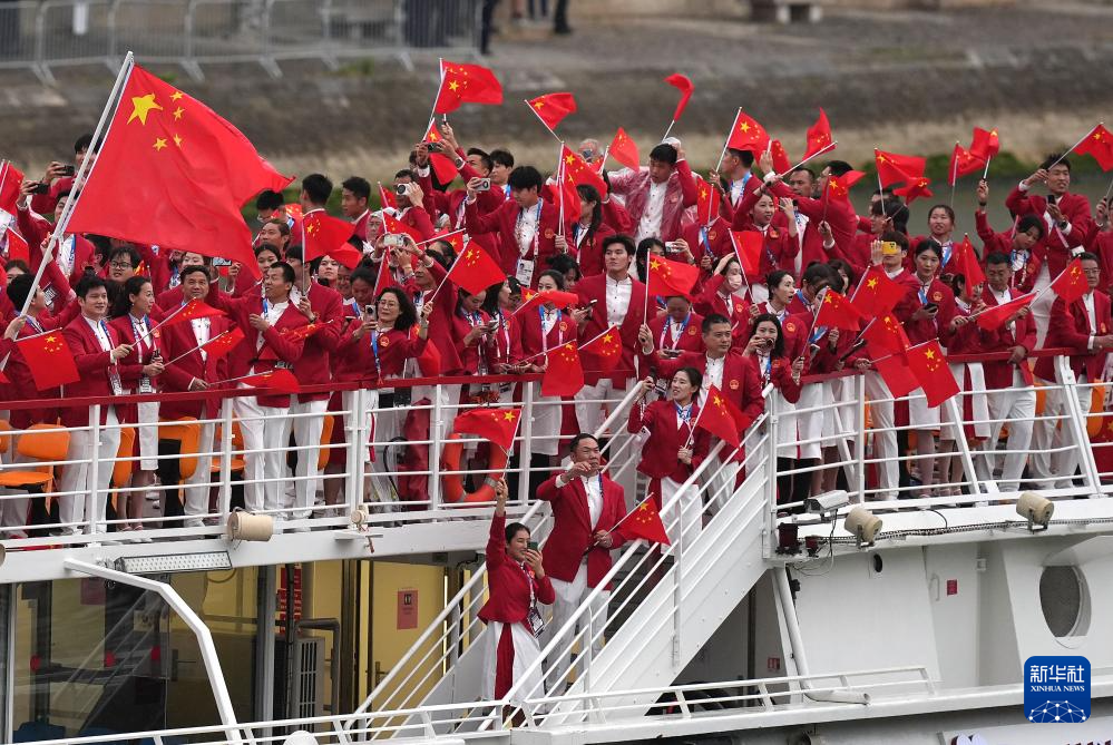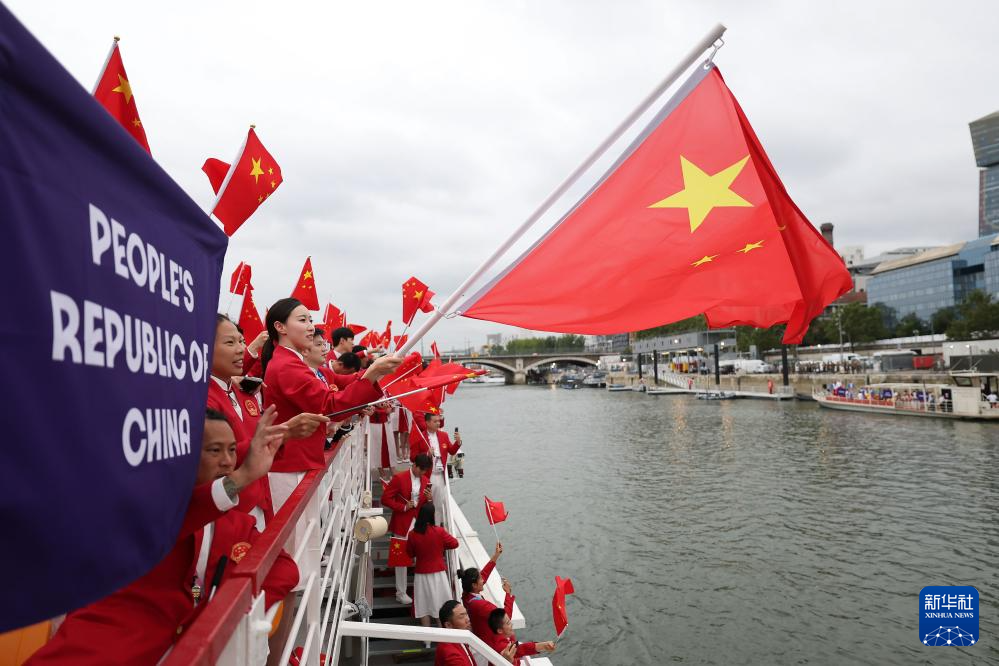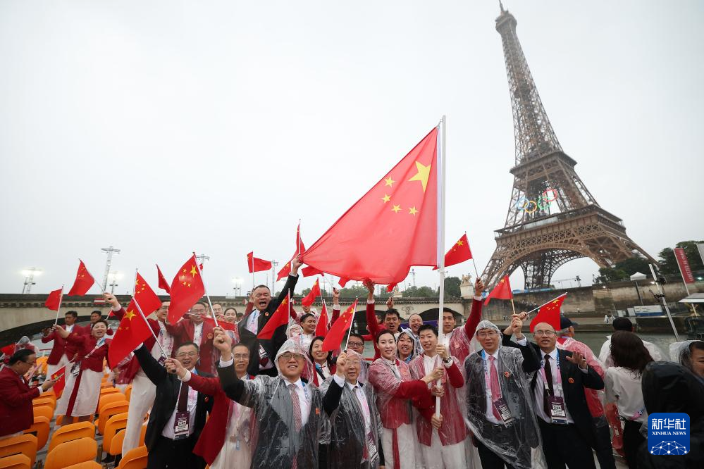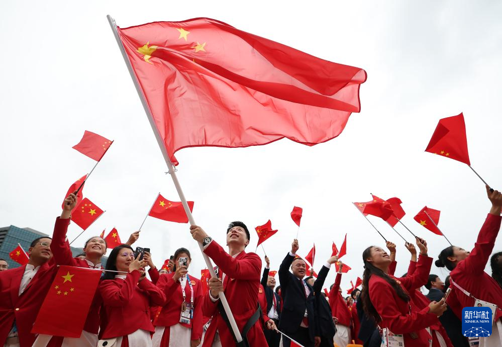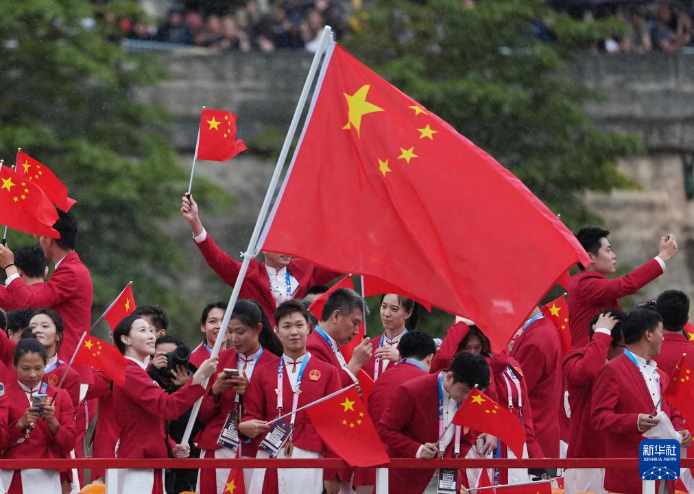 7月26日,中國(guó)體育代表團(tuán)在開(kāi)幕式上。新華社記者 郭昱 攝
