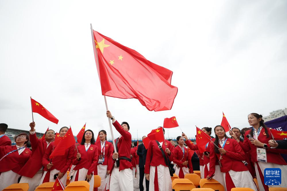 7月26日,中國(guó)體育代表團(tuán)旗手、花樣游泳選手馮雨在開(kāi)幕式上揮舞國(guó)旗。新華社記者 曹燦 攝
