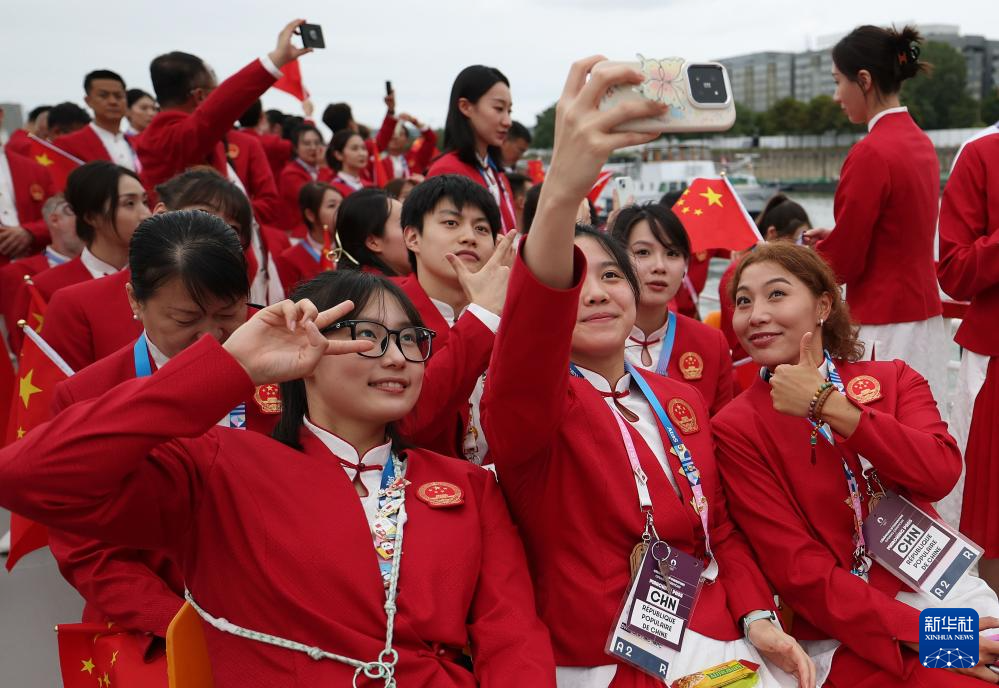 7月26日,中國(guó)體育代表團(tuán)成員在開(kāi)幕式前自拍留影。新華社記者 曹燦 攝