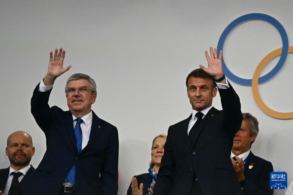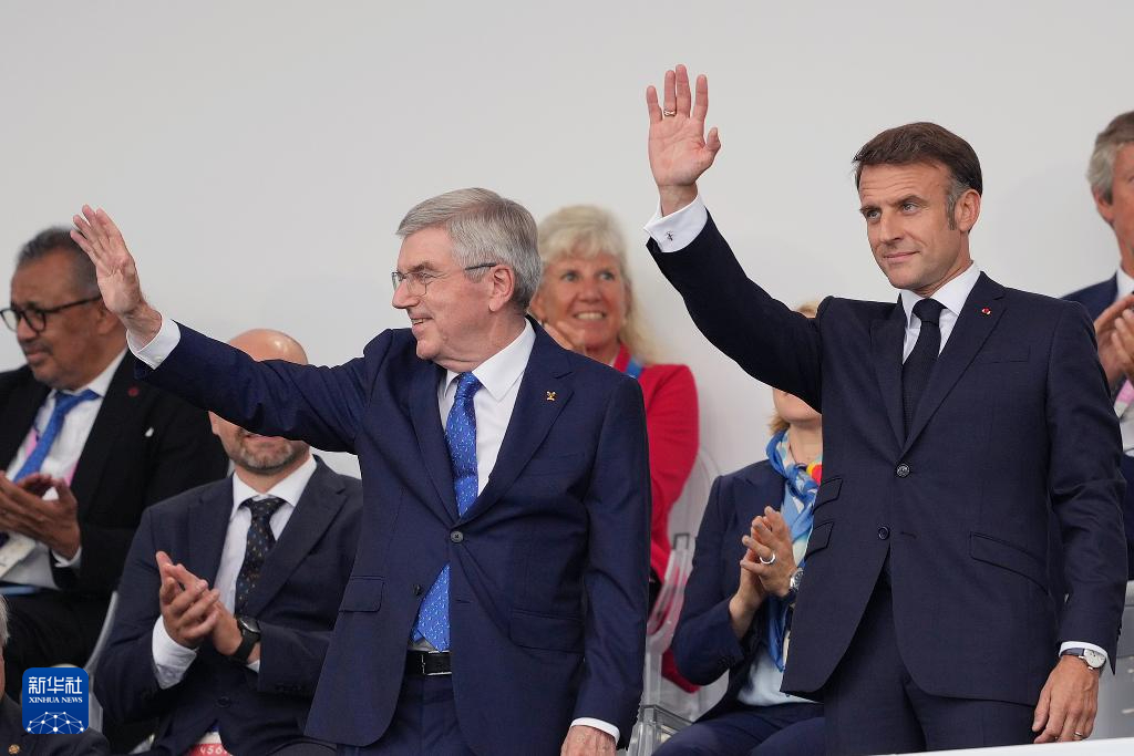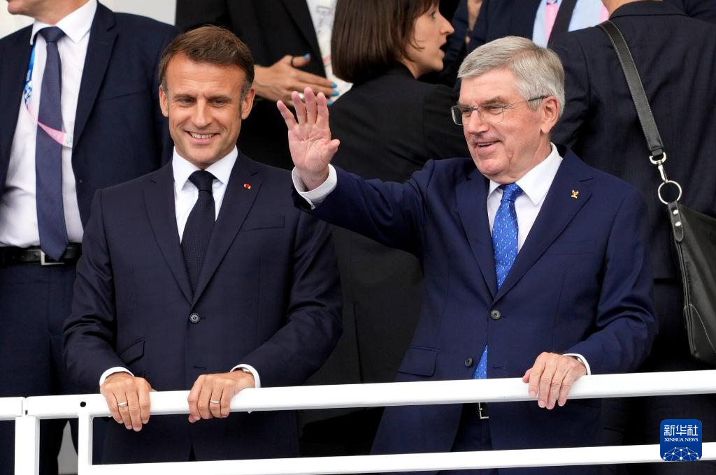 7月26日,國(guó)際奧委會(huì)主席巴赫(右)與法國(guó)總統(tǒng)馬克龍出席開(kāi)幕式。新華社記者 王毓國(guó) 攝
