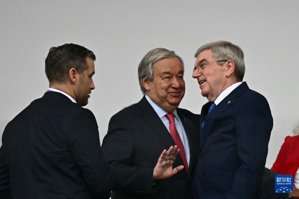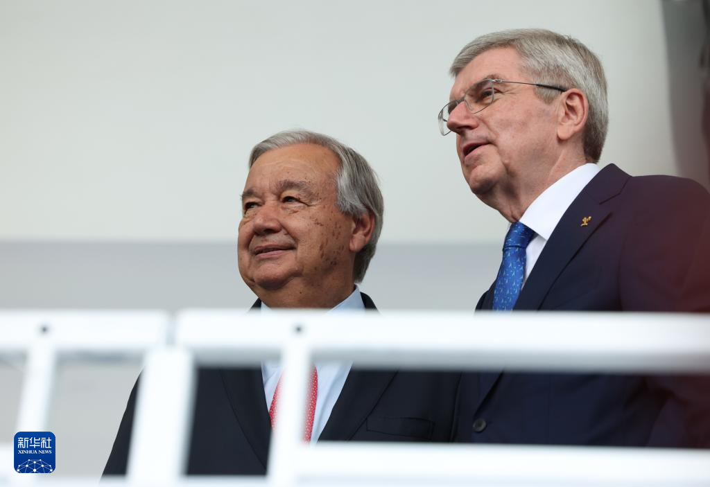 7月26日,國(guó)際奧委會(huì)主席巴赫(右)與聯(lián)合國(guó)秘書長(zhǎng)古特雷斯出席開(kāi)幕式。新華社記者 高靜 攝pagebreak