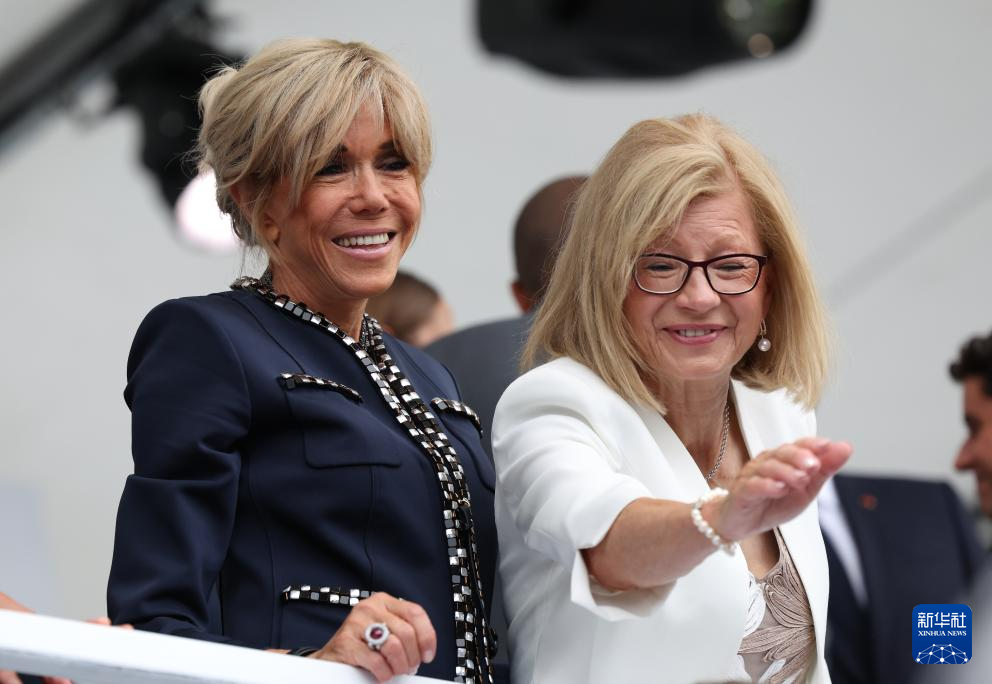 7月26日,法國(guó)總統(tǒng)馬克龍夫人布麗吉特(左)在開(kāi)幕式現(xiàn)場(chǎng)。新華社記者 高靜 攝pagebreak