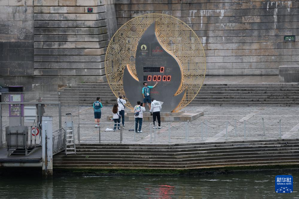 7月26日,志愿者與奧運(yùn)倒計(jì)時(shí)牌合影。新華社記者 李明 攝