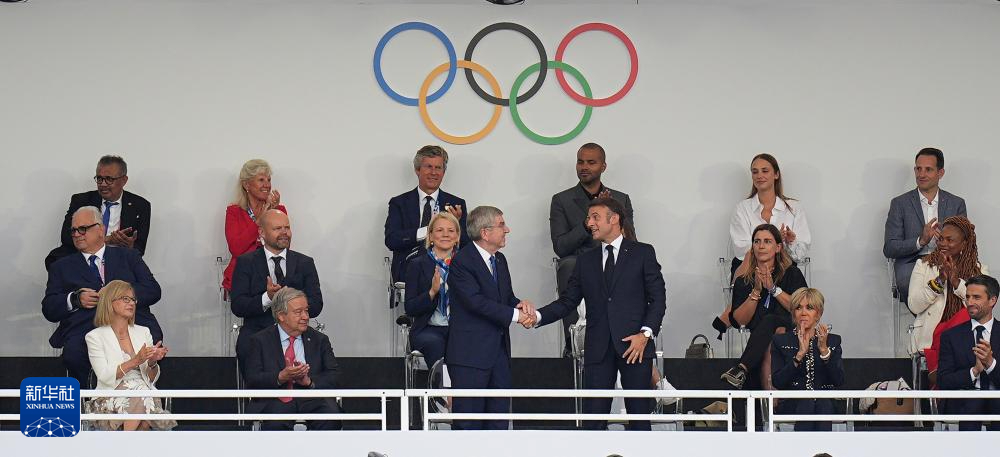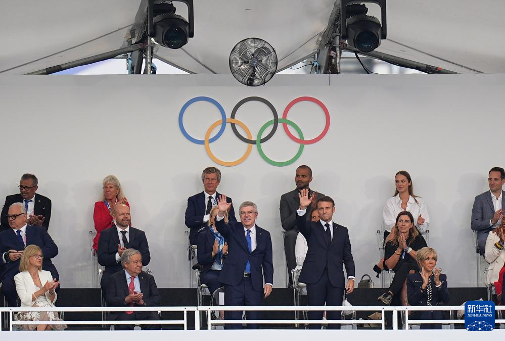 7月26日,國(guó)際奧委會(huì)主席巴赫(前排左五)和法國(guó)總統(tǒng)馬克龍(前排右四)出席開(kāi)幕式。新華社記者 沈伯韓 攝