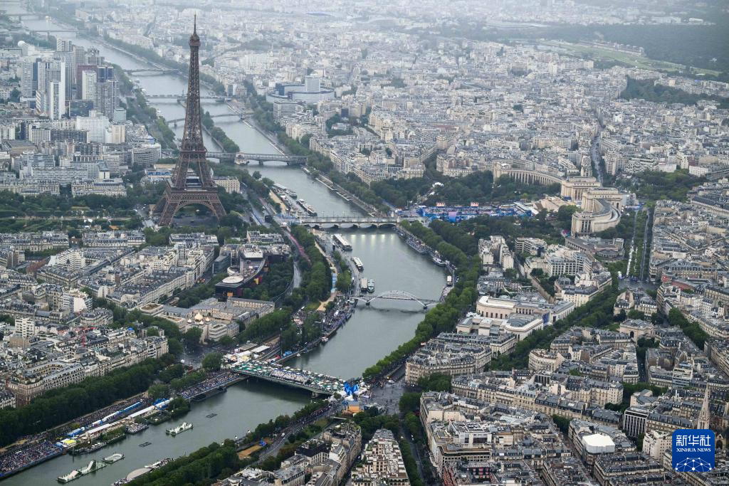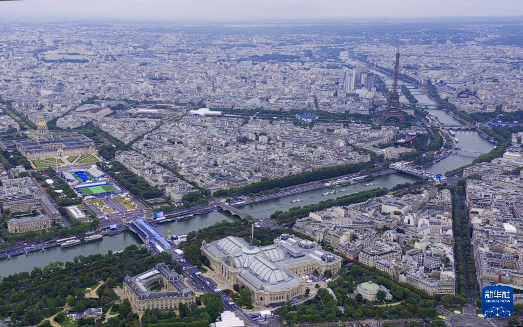 這是開(kāi)幕式上拍攝的埃菲爾鐵塔(右上)、巴黎大皇宮(下)(7月26日攝)。新華社發(fā)(POOL照片)