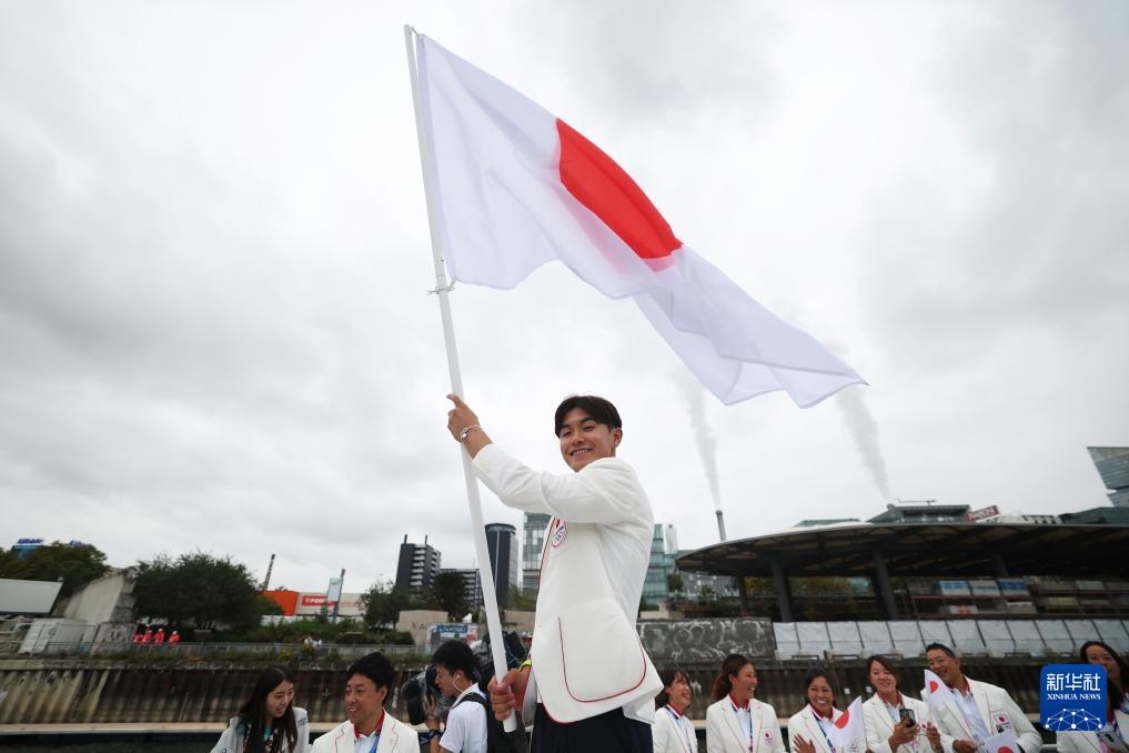 7月26日,日本體育代表團(tuán)旗手、霹靂舞運(yùn)動(dòng)員半井重幸在開(kāi)幕式上揮舞國(guó)旗。新華社發(fā)(POOL照片/邁克爾·里夫斯)pagebreak