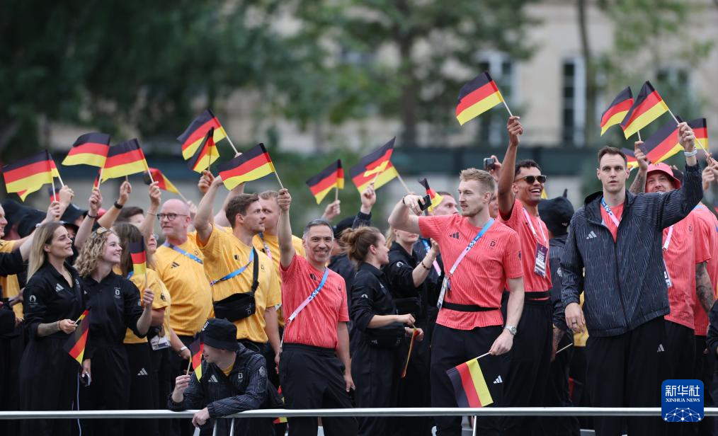 7月26日,德國(guó)體育代表團(tuán)成員在開(kāi)幕式上慶祝。新華社記者 李明 攝pagebreak