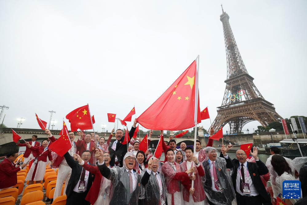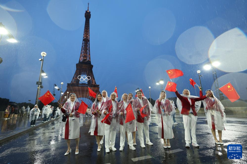 7月26日,中國(guó)體育代表團(tuán)成員在開(kāi)幕式現(xiàn)場(chǎng)。新華社記者 王毓國(guó) 攝