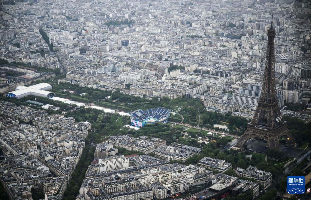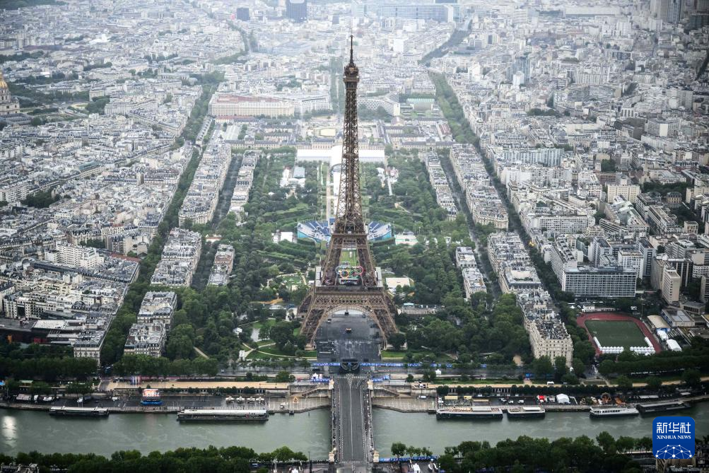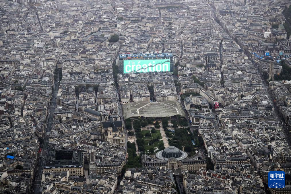 俯瞰開(kāi)幕式上的埃菲爾鐵塔和戰(zhàn)神廣場(chǎng)(7月26日攝)。新華社發(fā)(POOL照片/利昂內(nèi)爾·博納旺蒂爾)