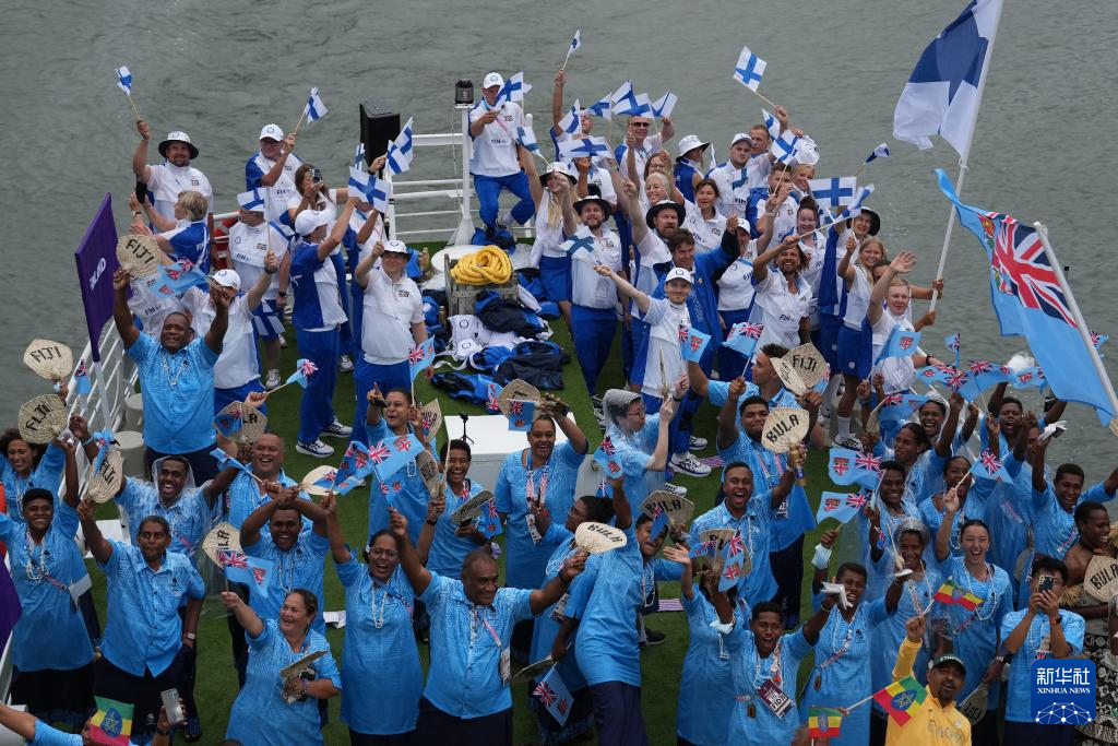 7月26日,芬蘭體育代表團(tuán)(上)與斐濟(jì)體育代表團(tuán)在開(kāi)幕式上。新華社記者 萬(wàn)象 攝