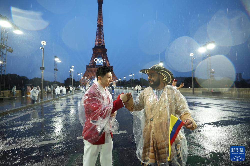 7月26日,中國(guó)體育代表團(tuán)旗手、乒乓球選手馬龍(左)與哥倫比亞體育代表團(tuán)成員在埃菲爾鐵塔前相互致意。新華社記者 李明 攝