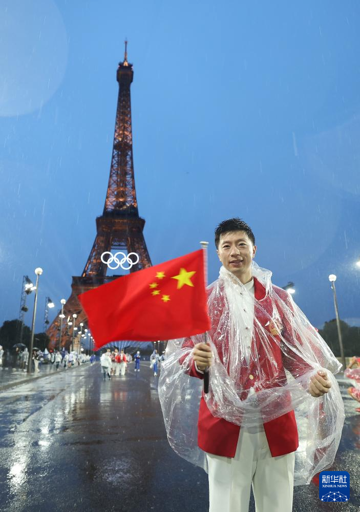 7月26日,中國(guó)體育代表團(tuán)旗手、乒乓球選手馬龍?jiān)诎7茽栬F塔前。新華社記者 李明 攝