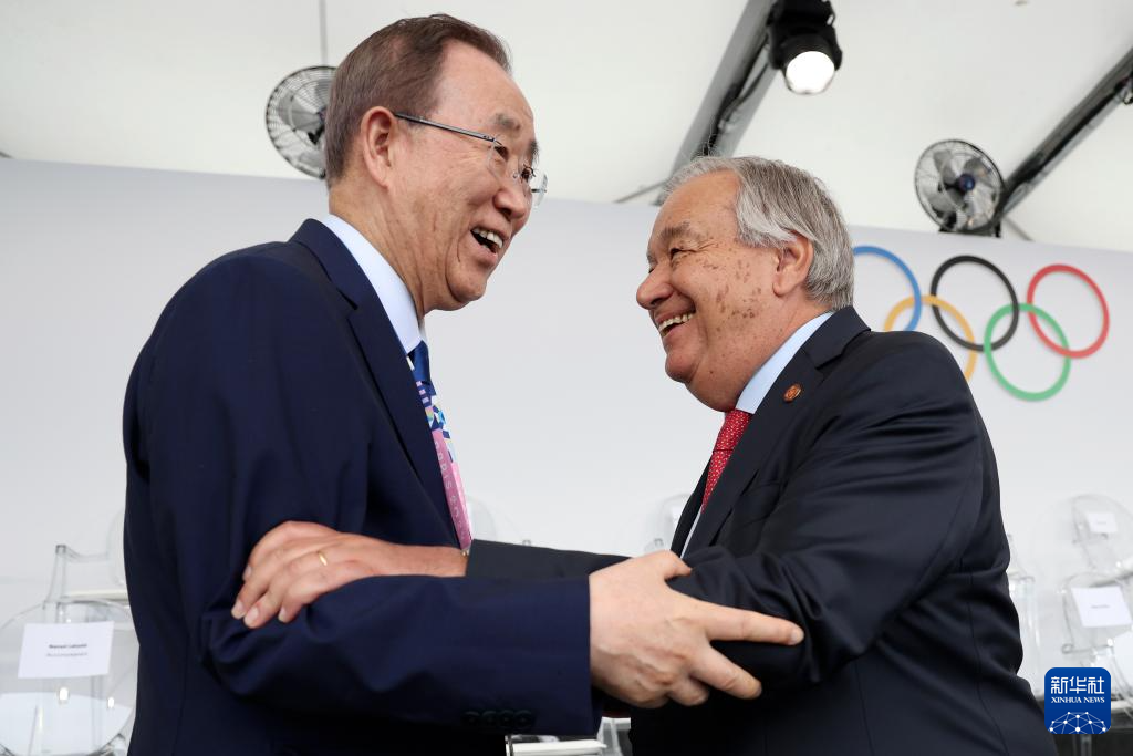 7月26日,聯(lián)合國(guó)秘書長(zhǎng)古特雷斯(右)與聯(lián)合國(guó)前秘書長(zhǎng)潘基文在開(kāi)幕式前致意。新華社發(fā)(POOL照片/帕斯卡爾·勒·塞格雷坦)