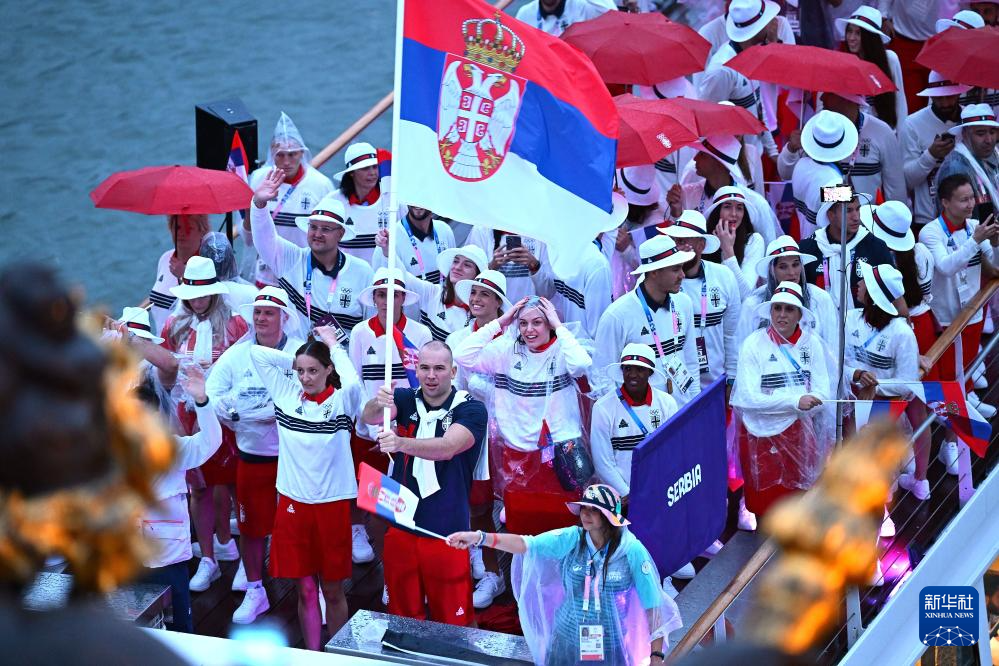 7月26日,塞爾維亞體育代表團(tuán)成員在開(kāi)幕式上。新華社記者 張宏祥 攝